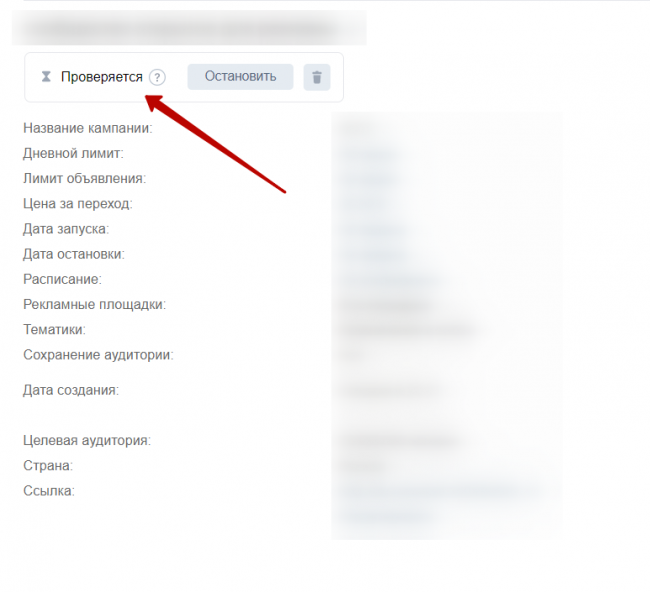 Реклама уходит на ручную проверку модератором и получает статус «Проверяется».