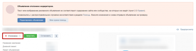 Здесь вы можете увидеть причину отклонения и сразу же исправить ошибки. Если причина отклонения непонятна, можно нажать на кнопку «Мне нужна помощь» и откроется ссылка на справку, где описывается именно ваш случай. После исправления стоит снова запустить объявление, чтобы оно ушло на повторную проверку.