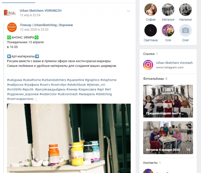 А вот группа городского сообщества любителей встретиться и порисовать скетчи в уютных местах: кафе, парках, скверах. Теперь это можно сделать в прямом эфире.