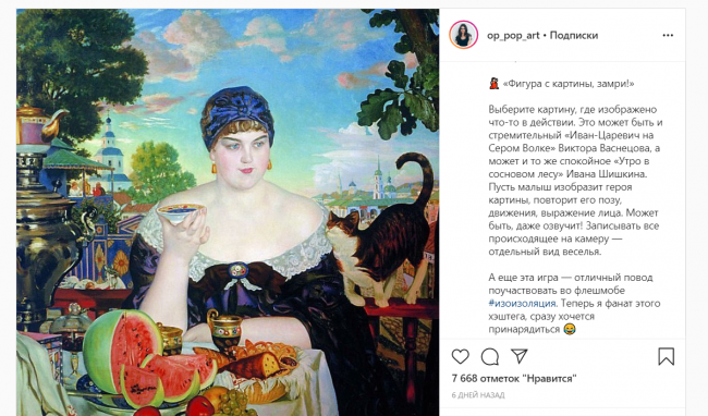 Для детей тоже есть интересные занятия. Например, искусствовед Анастасия Постригай в своем аккаунте в Instagram предлагает увлекательные творческие игры для детей под хэштегом #изоизоляция.