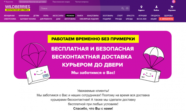 Такая доставка в нынешних условиях — настоящий тренд. Люди не хотят отказываться от привычных товаров и услуг, но стараются максимально избежать контактов, в том числе с курьерами. Бесконтактная доставка есть у крупнейших онлайн-ритейлеров, таких как Lamoda, Wildberries, Ozon.