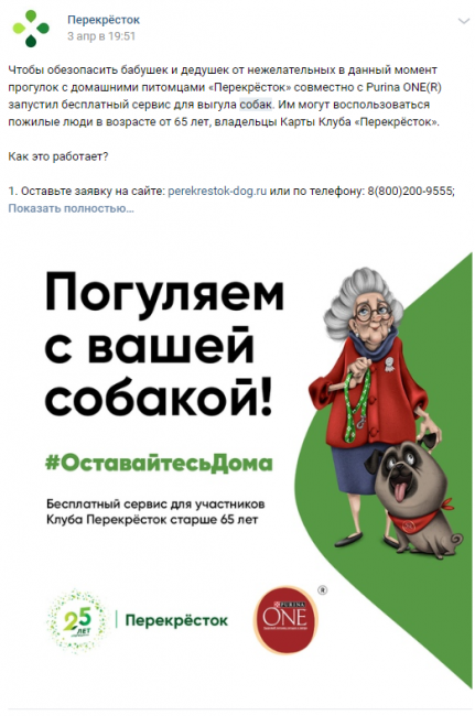 Пенсионеры — одна из самых уязвимых групп населения, и сейчас они особенно нуждаются в помощи. Для них запустили акцию «Перекрёсток» и бренд корма для животных Purina One. Они готовы взять на себя обязанность по выгулу собак.