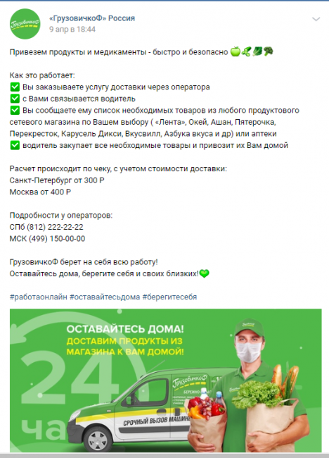 Сервисы «ГрузовичкоФ» и «ТаксовичкоФ» также занялись доставкой на дом продуктов и медикаментов