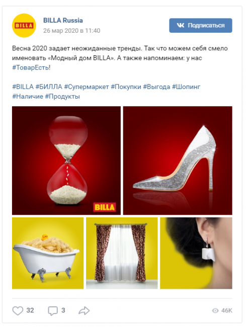 Не обошел стороной эту ситуацию и гипермаркет BILLA. Песок в часах заменили на рис, ванна наполнена макаронами, а на шторах принт из гречки.