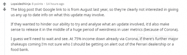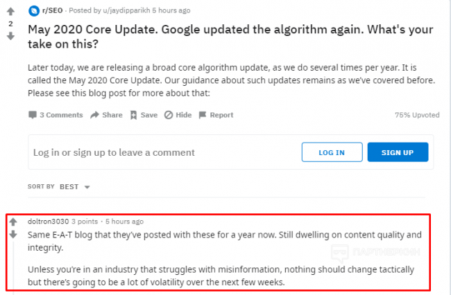 Другой пользователь пишет, что если бы Google пытался что-то скрыть от вебмастеров, то им следовало бы выпустить данный апдейт в период полной неразберихи в метрике (из-за коронавируса). Ну, и поскольку Гугл ссылается на документ 2019 года, они не заинетересованы в том, чтобы дать людям какую-либо актуальную информацию по апдейту. «Подождем — увидим»: