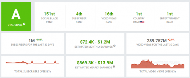 Сервис SocialBlade, основываясь на общеизвестных цифрах, таких как просмотры видео, выдает широкий разброс возможного заработка блогера — от $72 тысяч до $1,2 миллиона в месяц.
