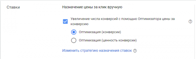 Прежде чем запустить тест, ставки выставляли вручную, при этом включали оптимизатор конверсий. Старые настройки выглядели так: