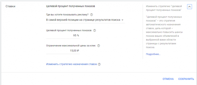 У нас возникла идея перевести брендовые кампании в Google на стратегию «Целевой процент полученных показов», которая позволяет получать необходимый объем трафика, при этом можно выставить ограничение по ставке.