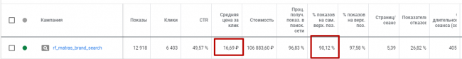 За целевой процент взяли 95% показов в самой верхней позиции на странице результатов поиска, потому что в основной кампании было 90%, а мы хотим показываться больше.