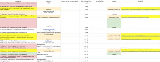 В другом кейсе рекомендуется завести таблицу, куда вы будете вносить информацию по своим откликам, чтобы иметь возможность следить за размещениями, а также в случае схожего запроса сразу же достать уже отправленный неопубликованный ответ. В таблице стоит указать источник запроса, на чье имя отправлено, сам ответ, почту журналиста: