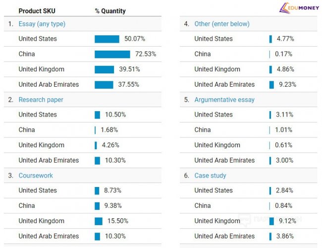 Аналитика показывает, что бакалавры приносят больше половины прибыли по всем ГЕО. В Китае на втором месте ученики колледжей - 36.35%. А заказывать на магистратуре предпочитают в Великобритании и Арабских Эмиратах, что приносит четверть прибыли по данным ГЕО. Самой популярной работой считается эссе, и данный тип работы заказывают аж 72.53% китайской аудитории и 50% американской: