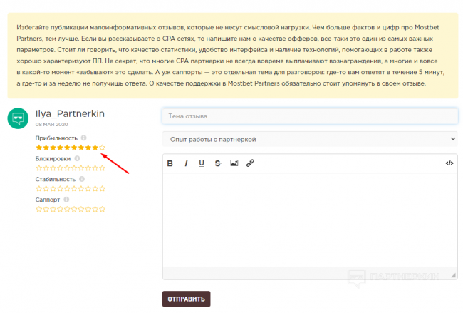 Пробуждаем в себе Пушкина и начинаем писать отзыв. В поле «Тема отзыва» кратко напишите о чем ваш отзыв («Повысили ставку, дружелюбный саппорт, рекомендую», «Заблокировали аккаунт, поддержка молчит»). Не забывайте выставить звездочки в каждой из категорий (саппорт, технологии, качество офферов, надежность).