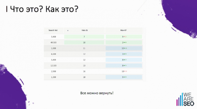 Как это обычно происходит? Начинают атаку на сайт. Ответственная команда замечает это по дропу позиций, но прошло уже дней 5. Ведь аналитика дает данные с задержкой. Команда сайта начинает действовать. Проходит еще 2 недели. Считаем поведенческие факторы за месяц и, вуаля, сильно просели. Можно легко вылететь за топ-100. После такого полета очень сложно восстановить позиции ссылками или другими известными методами. Придется ждать до 7 месяцев обновления базы Google. Если за это время вы защититесь, улучшите органический own-page и поведенческие, то есть низкий шанс вернуться. Чем раньше вы начнете защищаться, тем выше шанс восстановить позиции.