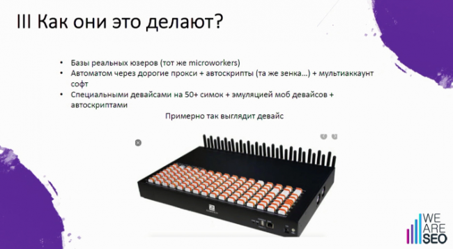 Существуют огромные базы реальных юзеров, где людям платят за определенные действия. Получаем своеобразную армию. Это самый рабочий и дорогой метод. Существует еще один способ. Валить проект автоматически через дорогие 3G прокси + автоскрипты. Также подключают мультиаккаунт, чтобы с одного компьютера регистрироваться на 300 учетных записей. Существуют специальные девайсы, в которые вставляют 50 симкарт и эмулируют работу мобильных гаджетов. Они подключаются по usb к вашему компьютеру и с каждой симкарты отображают реальный мобильный браузер.