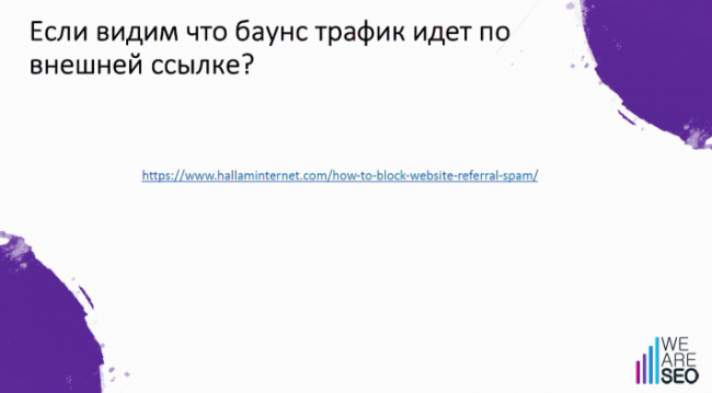 Если видим, что Bounce трафик идет по внешней ссылке, читаем отличным материал по ссылке ниже. Это хороший чек-лист, благодаря которому можно блокировать трафик с определенных рефералов, только чтобы он работал, вводить их нужно без wwwhttphttps.