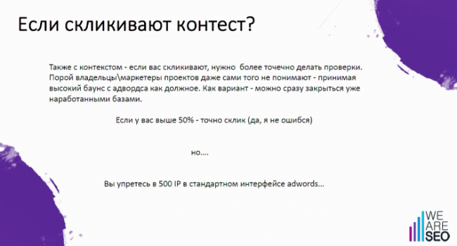 Часто владельцы сайтов или маркетологи принимают высокий Bounce Rate, как должное. Если у вас показатель выше 50% на контексте — это 100% скликивание. Проще всего, закрыться наработанными или купленными спам-базами. Однако, вы быстро упретесь в диапазон 500 ip, который допускает стандартный интерфейс Adwords. Защищаемся до первого лимита. Далее уже вопрос профита. Лучше обратиться к специалистам. В случае больших бюджетов, сразу к нескольким командам. Есть ребята, которые тратят по $20 в месяц на контекст в Adwords, а у них скликивание до 70%.