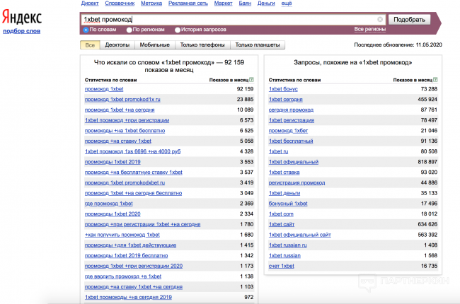 Wordstat.yandex.ru доступен только авторизированным пользователям Яндекса, Яндекс почта у меня была, я авторизировался и пробил поисковый запрос 1xbet промокод, оказалось запросов достаточно.