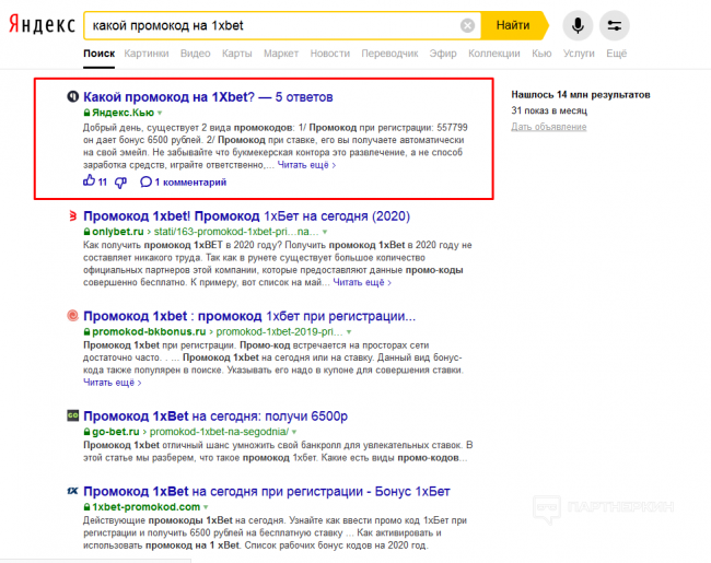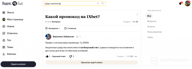 Далее я пошел в сервис Яндекс Кью и создал вопрос: "Какой промокод на 1Xbet?"