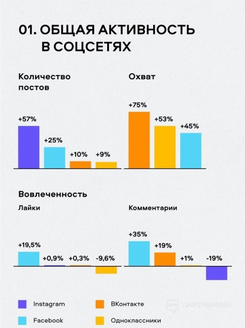 Количество постов в Instagram увеличилось на 57%, при этом количество лайков практически не изменилось (рост на 0,9%), а количество комментариев и вовсе просело — -19%. Единственные соцсети, демонстрирующие положительную динамику, — Facebook и ВКонтакте. Стоит отметить, что у Фейсбука самые впечатляющие показатели: рост числа лайков на 19,5% и числа комментариев на 35%.