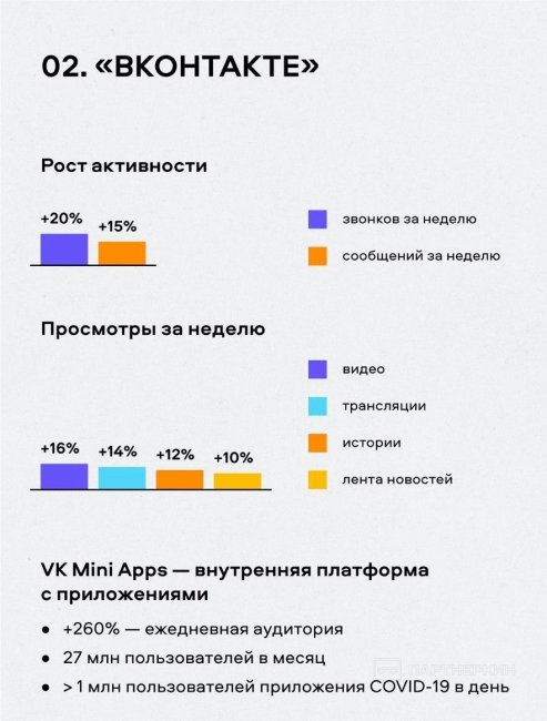 Развлечения в период карантина не особо разнообразны: либо кино посмотреть, либо в игры поиграть, либо в соцсетях поползать. Являясь самой популярной соцсетью нашей страны, ВК закономерным образом показывает рост по всем показателям.