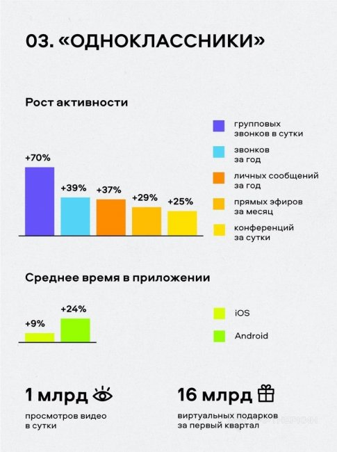 В глаза сразу же бросается несколько показателей. Во-первых, рост групповых звонков в сутки на 70% — в отличие от того же ВК, аудитория ОК более консервативная, поэтому предпочитает не пользоваться сторонними приложениями для видеосвязи. Во-вторых, 1 млрд просмотров видео в сутки — что тут говорить, в период карантина людям приходится себя как-то развлекать. В-третьих, количество виртуальных подарков за первый квартал (16 млрд) — здесь даже сложно представить, сколько подарков в среднем отправляет типичный пользователь соцсети (наверняка очень много).