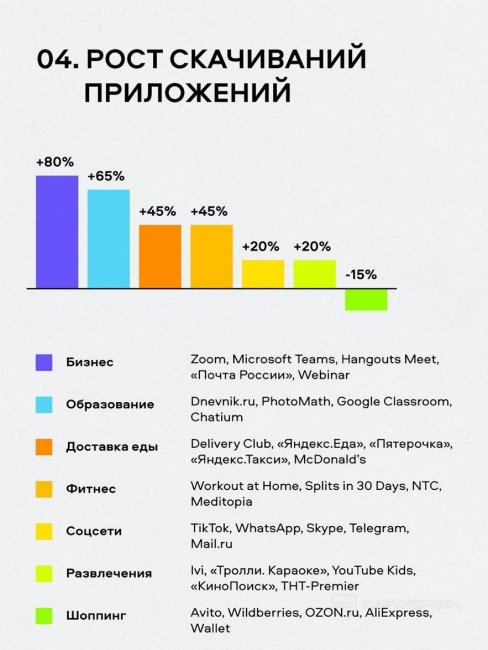 Самый впечатляющий рост скачиваний демонстрируют приложения из категорий «Бизнес» и «Образование» — +80% и +65% соответственно. Следом идут фитнес-приложения и доставки еды — +45%. Хуже всего пришлось приложениям из категории «Шоппинг» — их стали скачивать на 15% меньше.
