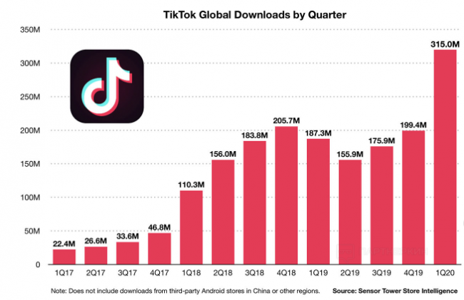 Отдельно хочется сказать про лидера всех зумеров (а теперь, кстати, и бумеров) — TikTok. Согласно отчетам, только за первый квартал этого года приложение скачали около 315 миллионов раз. Еще одно закономерное явление, только в данном случае люди скачивают не только ради того, чтобы посмотреть чужие видео, но и с целью поделиться своими мыслями, миниатюрами и сценками про то, как проводят карантин.