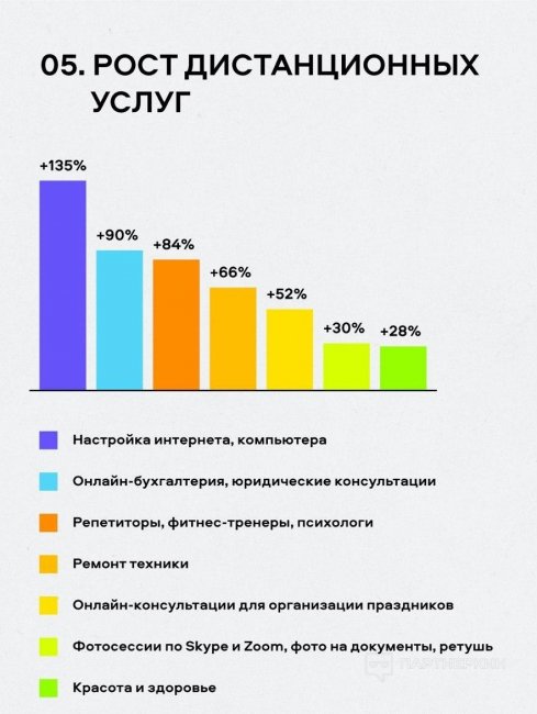 Постоянное нахождение дома вынуждает людей пользоваться услугами дистанционно. Так, спрос на настройку интернета и компьютера вырос аж на 135%. Вполне возможно, что после самоизоляции мы перестанем видеть рекламные вывески у подъездов в стиле «Мастер Артём. Настройка интернета», и люди окончательно перейдут на дистанционный способ взаимодействия.