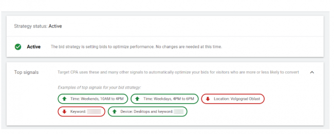 Чтобы зайти в отчет, в списке рекламных кампаний найдите столбец «Стратегия управления ставками». Если вы используете умную стратегию, ее название будет кликабельным. Кликнув на название, вы откроете нужный отчет. В этом отчете видно, активна ли стратегия и какие сигналы она смогла выделить.