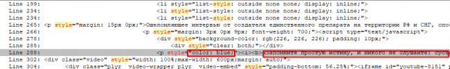 На картинке мы видим, что элемент выделен голубым цветом, прочитав дальше, несложно догадаться, что так выделена одна из фраз. Просто меняем blue на pink, сохраняем, смотрим, что получилось:
