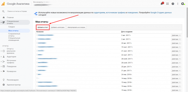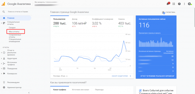 Заходим в Google Analytics в раздел «Мои отчеты».