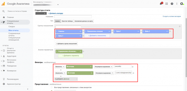 в фильтрах указываем источники, по которым будем строить отчет. В данном случае нас интересуют источники таргетированной рекламы — «ВКонтакте», myTarget, Facebook.