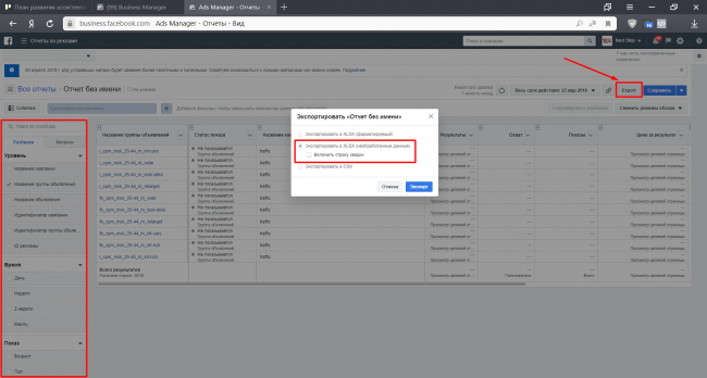- Данные по Facebook мы выгружаем из самого кабинета Facebook Ads.
