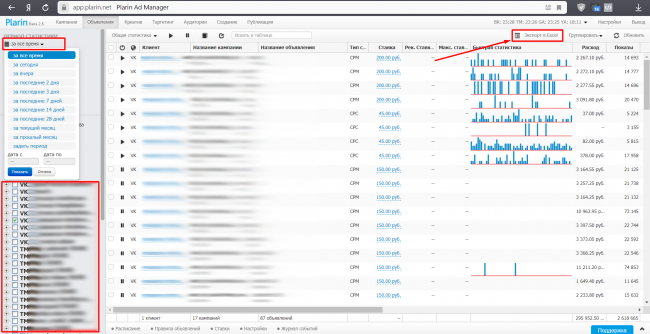 Заходим в кабинет, выбираем нужный период, рекламные аккаунты и кампании и нажимаем «Экспорт в Excel».