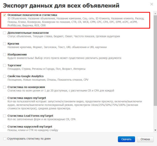 Для экспорта выбираем «Основные показатели и статистика».