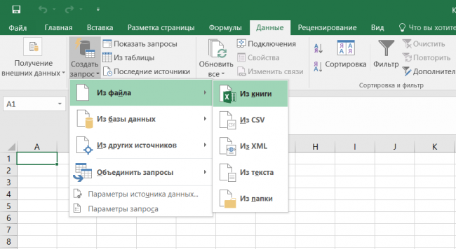 Открываем Excel — «Данные» — «Создать запрос из файла». Выбираем сначала файл с выгрузкой из Facebook.
