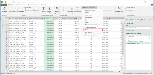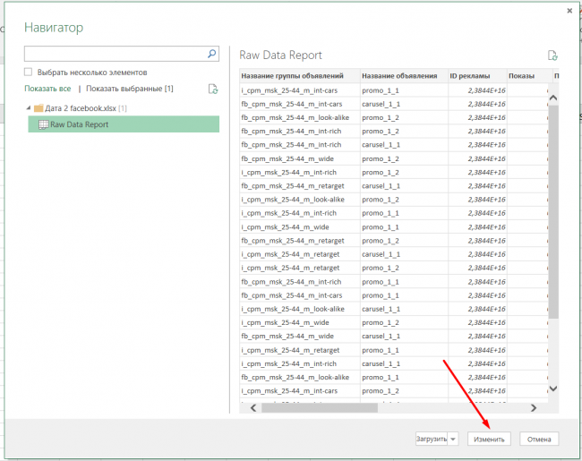 Перед загрузкой нужно изменить тип данных для столбца ID рекламы, чтобы впоследствии они загружались в нужном формате. Нажимаем «Изменить».