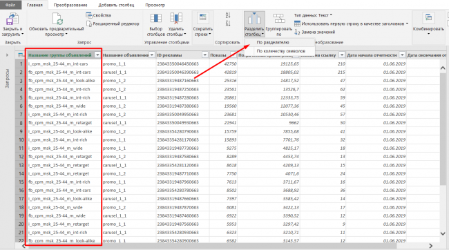Далее разделяем столбцы, для этого мы вводили единый нейминг во всех кампаниях. В нашем случае разделитель — нижнее подчеркивание.