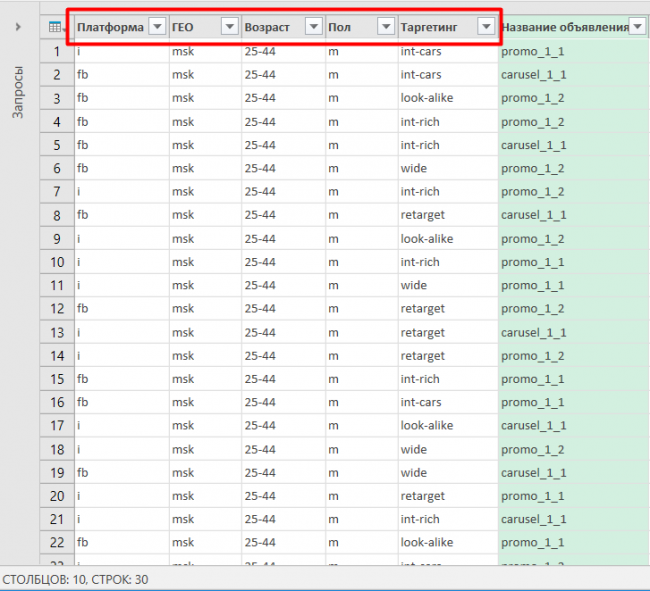 Переименовываем столбцы в зависимости от вида данных в нейминге. В нашем случае это платформа, гео, возраст, пол, таргетинг.