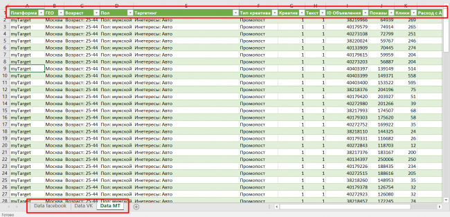Первая таблица с данными готова. Далее по аналогии нужно загрузить на соседних листах данные с «ВКонтакте» и myTarget. В итоге получим три листа с данными по разным каналам. Важно, чтобы во всех листах названия столбцов были одинаковыми.