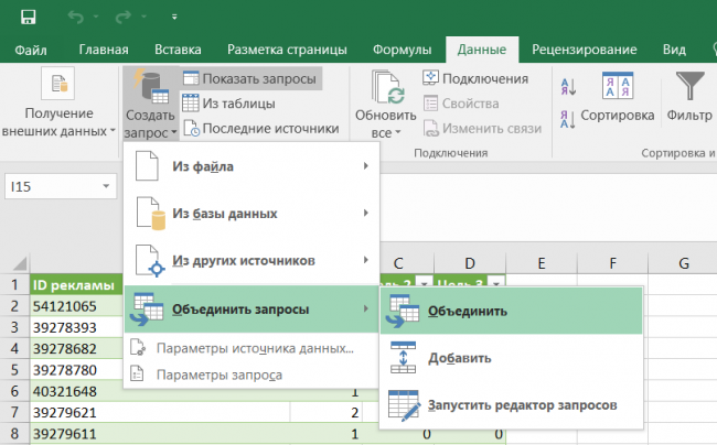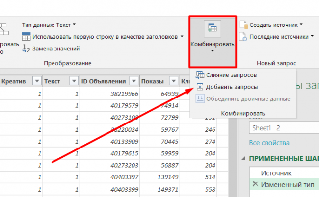 Выбираем «Комбинировать» — «Добавить запросы».