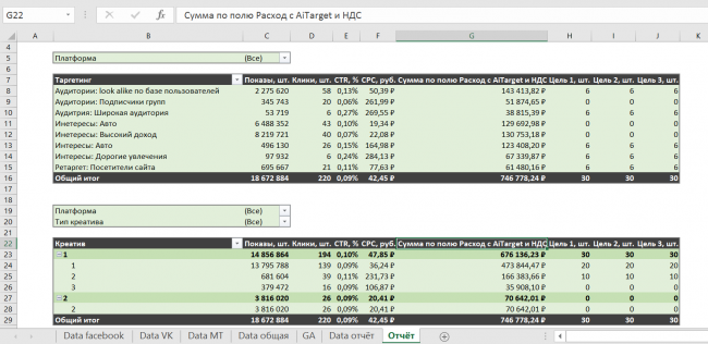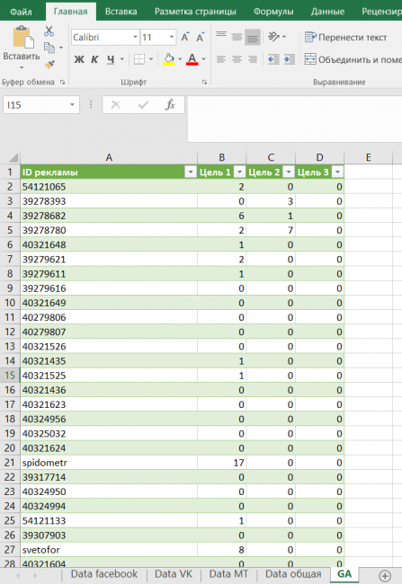 Теперь у нас объединены данные из трех рекламных кабинетов в одном листе «Data общая». В ней есть данные по кампаниям, таргетингам, показам, кликам, но нет данных по конверсиям. Для этого данные по рекламным кабинетам нужно свести с конверсиями из Google Analytics.