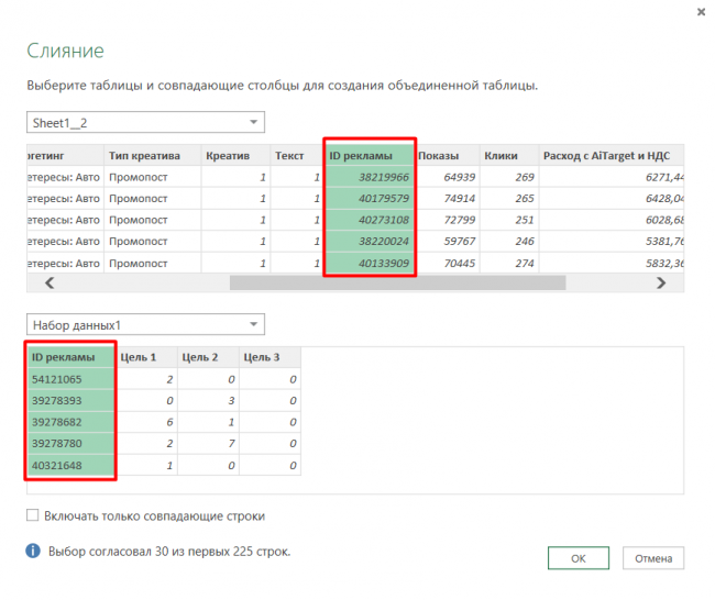 Выбираем параметр для слияния — «ID рекламы».
