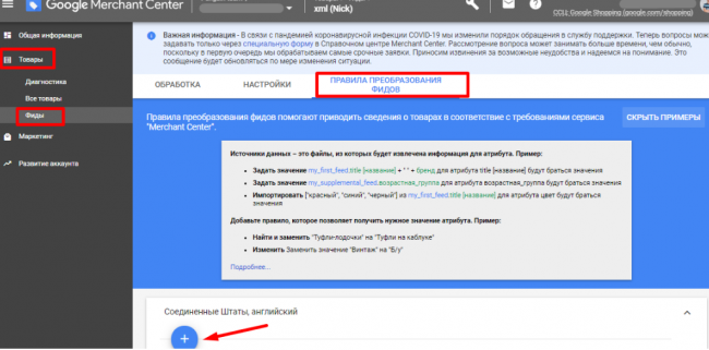 Правила создаются в Merchant: «Товары ? Фиды» ? выбираете нужный ? «Правила ? Создать правило» (плюсик):