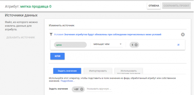 К примеру, мы хотим разделить весь ассортимент на несколько ценовых сегментов: товары до $5, от $10 до 15, от $15 до 20. При настройке кампании мы сможем выделить эти сегменты в отдельные группы и применять разные стратегии назначения ставок. Для этого нажимаете на «Добавить источник» и указываете условия. У нас в примере параметры будут связаны с атрибутом price.
