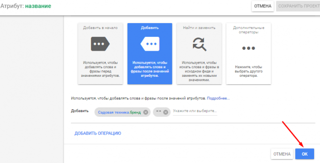 - Для другого клиента мы указывали название бренда в тайтле через правило «Добавить».