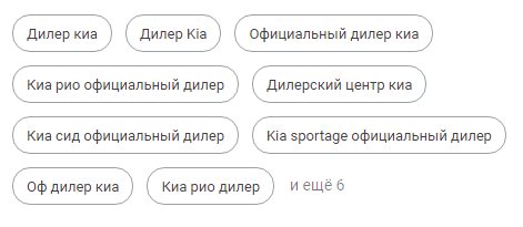 Ключи подбирались в разных вариациях, чтобы охватить все, что вбивает потенциальный клиент в поиске: точечные с названием дилера и его улицы, с упоминанием бренда KIA и словами «покупка», «сервис», популярные модели KIA и рекомендованные Google ключи — часто он предлагал полезные.