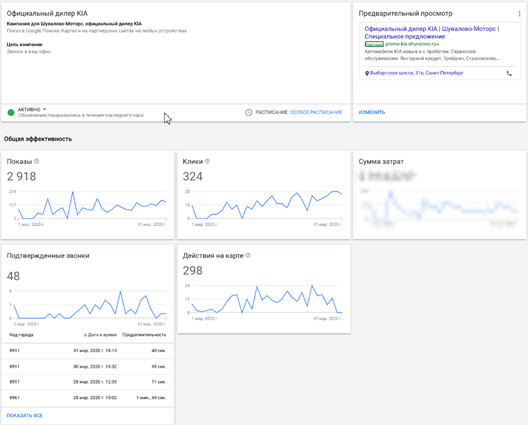 Результаты рекламной кампании в Google Картах за март 2020 года