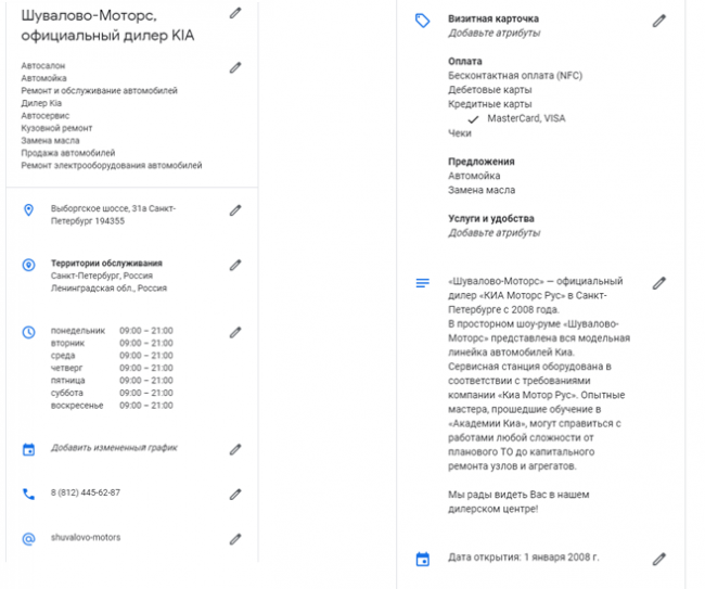 Данные должны быть верными в основных и дополнительных категориях. Не стоит ограничиваться адресом и телефонами, добавьте фотогалерею, новые услуги, удобства. Например, в карточке автодилера можно указать, есть ли детская комната или Wi-Fi.