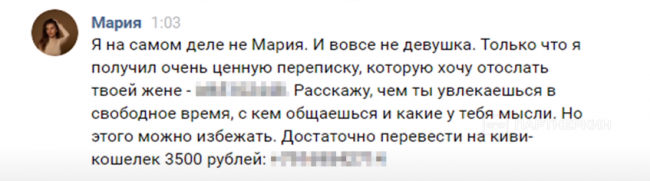 1. Имеет девушку или жену, но все равно пишет — изменщики. Найти таких достаточно просто. Если нет никакой инфы в профиле, заходим в друзья и ищем однофамильцев — часто такие люди не заморачиваются над тем, чтобы кого-то скрывать. Шантажировать их тоже просто: ждем, пока мужчина предложит встретиться, обсудить дальнейшие отношения, а затем прерываем беседу и сообщаем, что вышлем переписку его жене/девушке. Забыть эту переписку мы сможем, если подопытный отправит на Киви, например, 1-4 тысячи рублей.